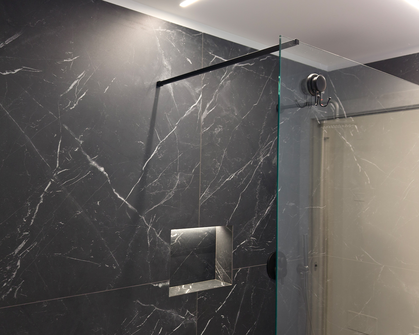 Diversamente nel bagno padronale la monocromia viene interrotta da rivestimenti Gardenia nella collezione Marmoteca (Marquina Black – 120×120 cm) perfettamente intonati alla pavimentazione e all’arredo bagno. Queste piastrelle effetto marmo ricoprono la parete su cui poggiano i sanitari e la doccia a tutta altezza, trasformando un semplice bagno in una piccola spa privata in cui potersi rilassare dopo una lunga giornata.