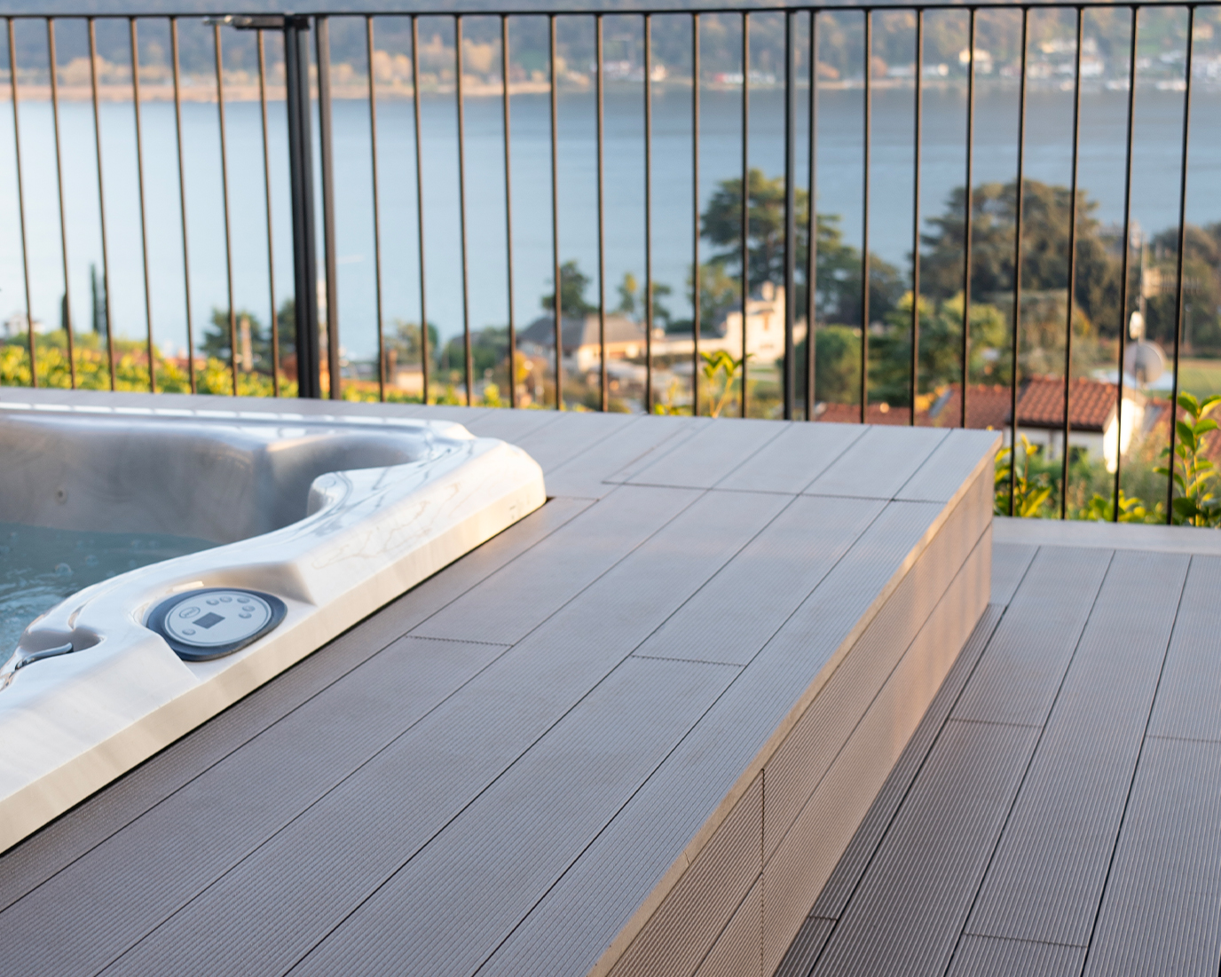 Sull’ampio terrazzo vista lago il grigio del gres utilizzato negli ambenti interni viene richiamato dalle piastrelle in gres effetto pietra by Ceramiche Keope (Chorus Beige R11 – 30×60 cm): l’effetto è di trovarsi in una nuova stanza della casa.